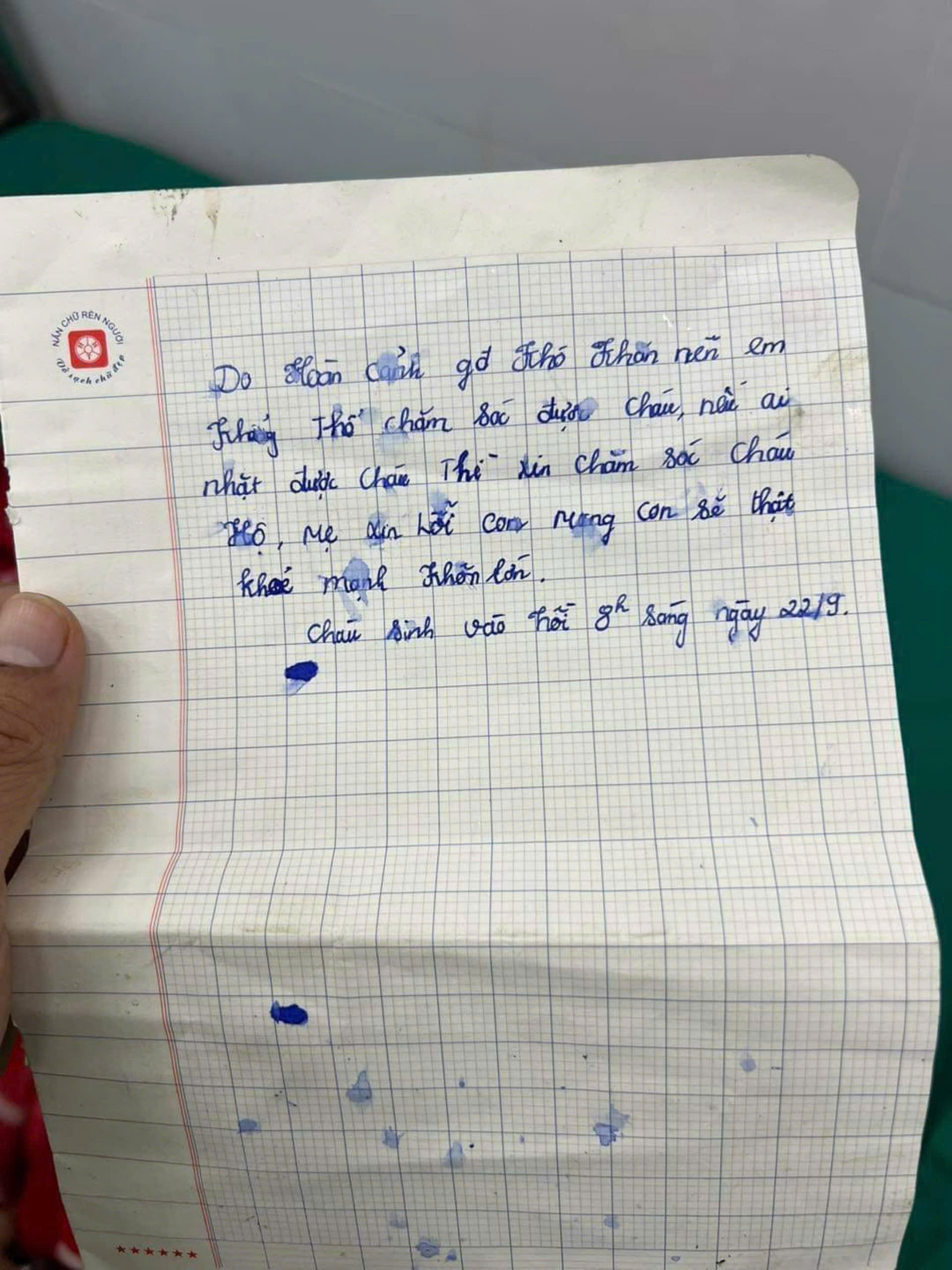 Mảnh giấy ghi lời nhắn: "Do hoàn cảnh khó khăn nên em không thể chăm sóc được cháu, nếu ai nhặt được thì xin chăm sóc cháu hộ, mẹ xin lỗi con, mong con sẽ được khoẻ mạnh, khôn lớn".