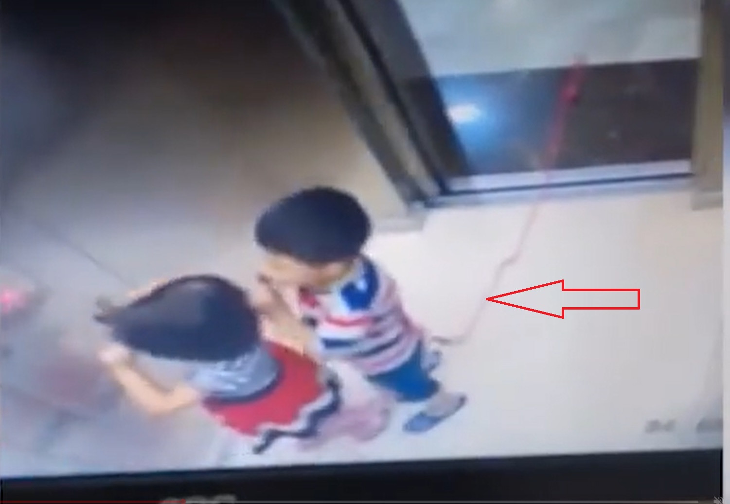 Theo clip, 3 cháu bé cùng nhau đi vào thang máy, một bé trai mang theo sợi dây dài lòng thòng. Khi cửa đóng lại thì một phần sợi dây mắc vào giữa cửa. Do một đầu sợi dây quấn vào cổ bé trai nên khi thang máy di chuyển đã kéo vọt bé trai lên treo lơ lửng sát cửa thang máy.