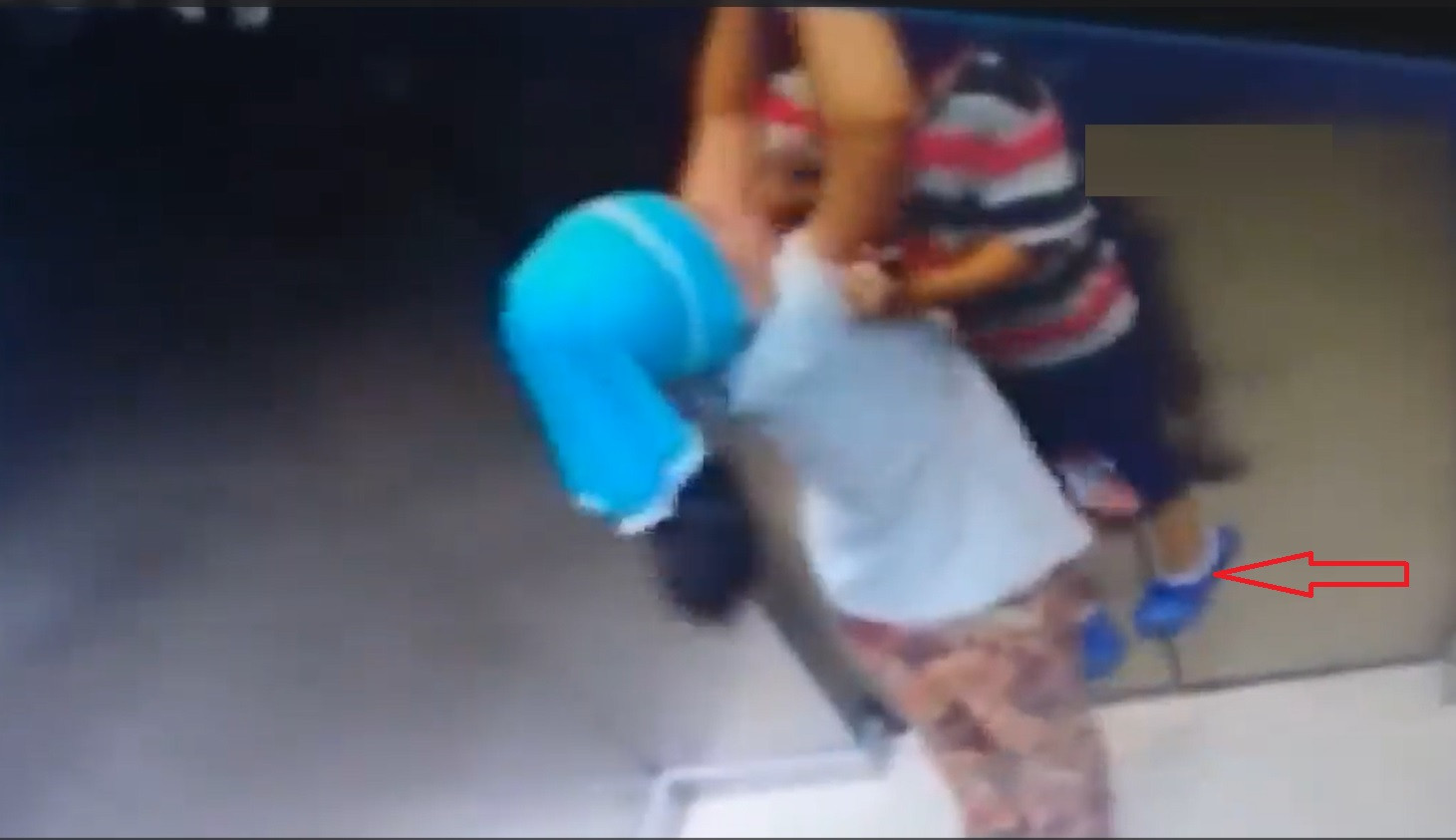 Bé trai sợ hãi liên tục giãy giụa. Rất may cô chị gái đi cùng đã có phản ứng nhanh nhẹn bế đỡ bé và liên tục bấm thang máy. Chiếc thang đã kịp dừng lại và bé trai may mắn thoán nạn.