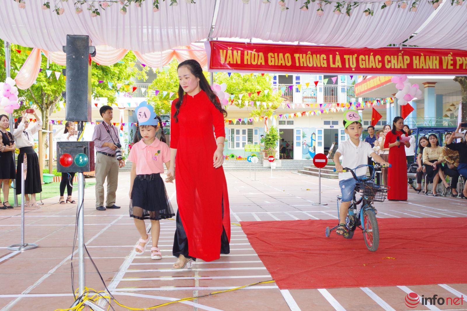 Cùng với đó, các bé vừa được đóng kịch vừa được trải nghiệm về tham gia giao thông theo tín hiệu của người điều khiển giao thông.