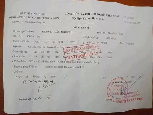 Bác sĩ Trần Văn Phú – Phó Giám đốc Bệnh viện đa khoa huyện Kim Sơn cũng thừa nhận thêm: "Sau khi nhân viên văn phòng đưa Giấy cho bác sĩ điều trị ký, anh ấy cứ thế ký rồi lại tiếp tục chuyển cho Phó Giám đốc ký nhưng cũng chẳng ai để ý. Cuối năm cũng nhiều việc nên để xảy ra sự việc đáng tiếc này".