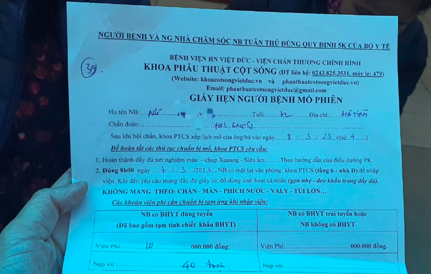 Nhiều tháng nay, bà M. (72 tuổi, ở Hà Tĩnh) bị đau cột sống thắt lưng, không thể đi lại như bình thường. Khám ở bệnh viện tỉnh, bác sĩ quyết định chuyển tuyến cho bà ra Bệnh viện Việt Đức (Hà Nội) để mổ.