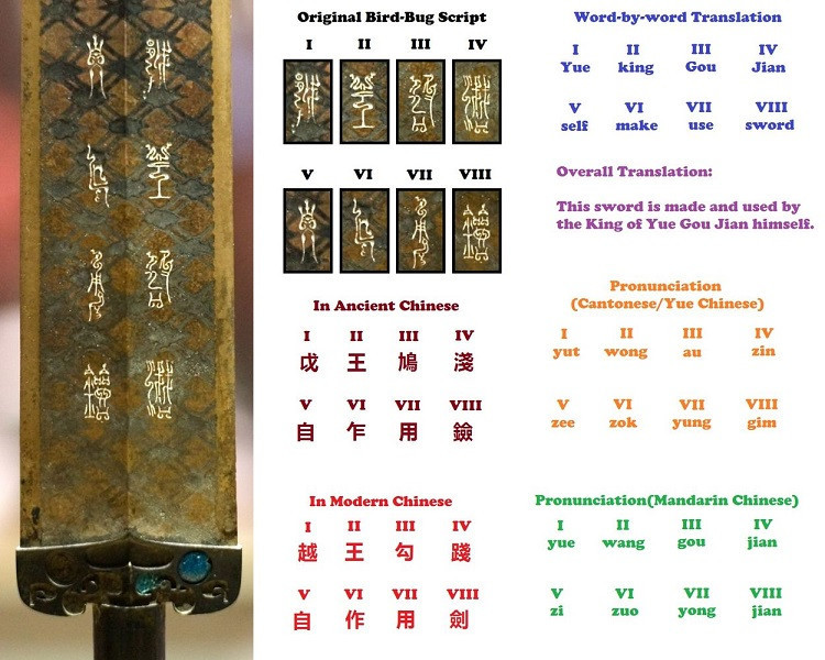 Ở một mặt trên thân kiếm gần phần cán có khắc hai cột chữ gồm 8 ký tự Hán cổ. Các nhà khoa học Trung Quốc sau một thời gian phân tích đã giải mã được 6 ký tự trong số đó. Đó là “Việt Vương tự tác dụng kiếm”, tức “Vua nước Việt tự chế tác kiếm để dùng”. Hai chữ còn lại có khả năng là tên của vị vua sở hữu.