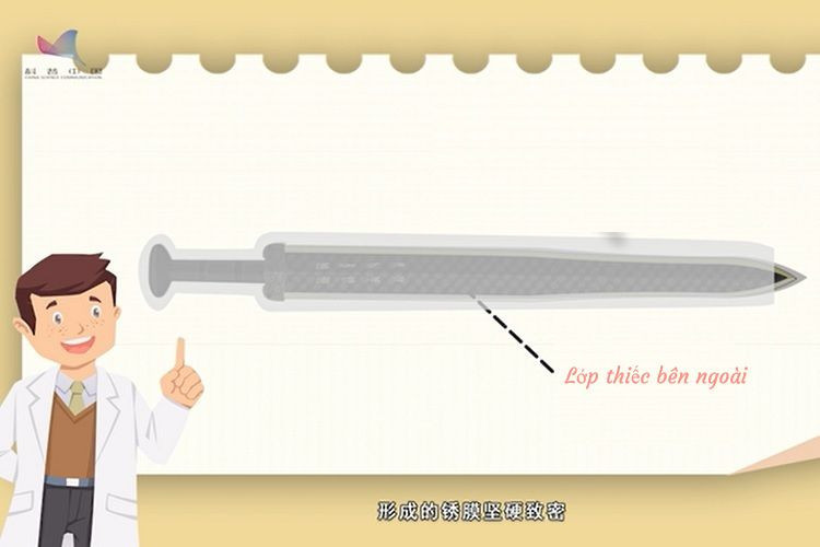 “Đầu tiên, bản thân thanh kiếm được làm từ vật liệu phù hợp là hợp kim giữa đồng, sắt, niken, thiếc, chì… với hàm lượng chì trong thanh kiếm rất nhỏ. Đây là điểm khác biệt giữa thanh kiếm này với những cổ vật khác được tìm thấy trong cùng một ngôi mộ, bởi các đồ vật có thành phần là chì ở mức cao sẽ bị ăn mòn nghiêm trọng. Đồng thời, thiếc tạo ra một lớp bảo vệ bên ngoài thanh kiếm khỏi bị oxy hóa”, tờ The Paper dẫn lời nhóm chuyên gia nói.