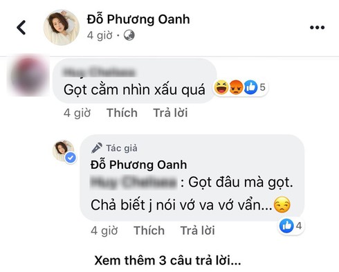 Trông thấy các bức ảnh chụp cận mặt Phương Oanh, anti-fan vào soi mói, ví chiếc cằm của nữ diễn viên nhọn hoắt như vừa được gọt. Người này viết: “Gọt cằm nhìn xấu quá!”. Bị anti-fan chê bai, Phương Oanh không ngần ngại đáp trả: “Gọt đâu mà gọt. Chả biết gì nói vớ va vớ vẩn”.