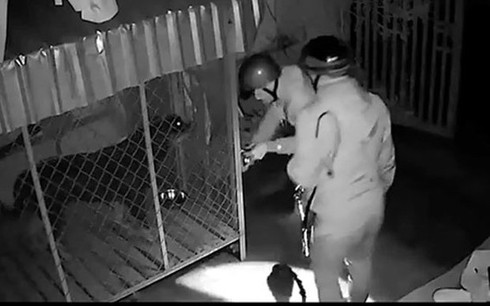 Khi mở cổng vào trong, các đối tượng đã bẻ khóa tại chuồng chó rồi dùng thòng lọng chích điện khiến 2 con chó bất tỉnh và lần lượt vác ra bên ngoài để tẩu thoát.