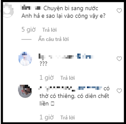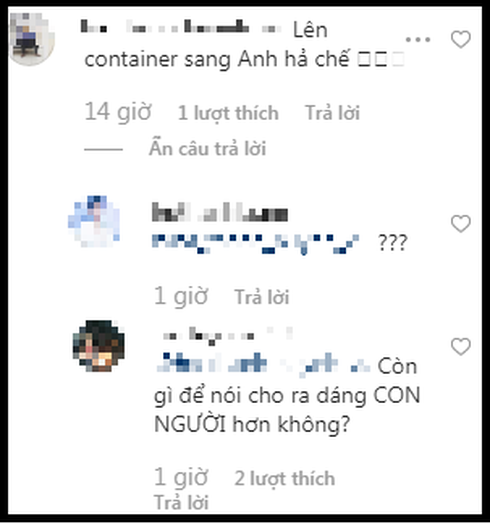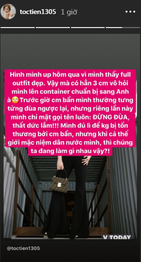 Trước những bình luận khiếm nhã này, Tóc Tiên đã bày tỏ thái độ phẫn nộ bức xúc. Cô chia sẻ: "Hình mình up hôm qua vì mình thấy full outfit đẹp. Vậy mà có hẳn 3 comment vô hỏi mình lên container chuẩn bị sang Anh à. Trước giờ comment bẩn mình thường tưng tửng đùa ngược lại, nhưng riêng lần này mình chỉ mặt gọi tên luôn: ĐỪNG ĐÙA, thất đức lắm! Mình đủ lì để không bị tổn thương bởi comment bẩn nhưng khi cả thế giới mặc niệm dân nước mình, thì chúng là đang làm gì nhau vậy?"