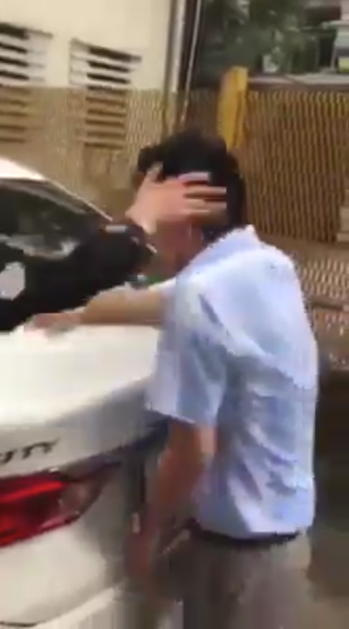 Ngay từ những giây đầu tiên của đoạn clip, cô gái và người đàn ông đã liên tục chửi bới, trong khi thầy giáo vẫn ngồi trong xe, miệng xin lỗi không ngừng và mong được từ từ giải quyết. Không khí mỗi lúc một căng thẳng hơn, người đàn ông được cô gái gọi đến đã tát tới tấp vào mặt thầy giáo và yêu cầu ông này ra khỏi xe để nói chuyện.