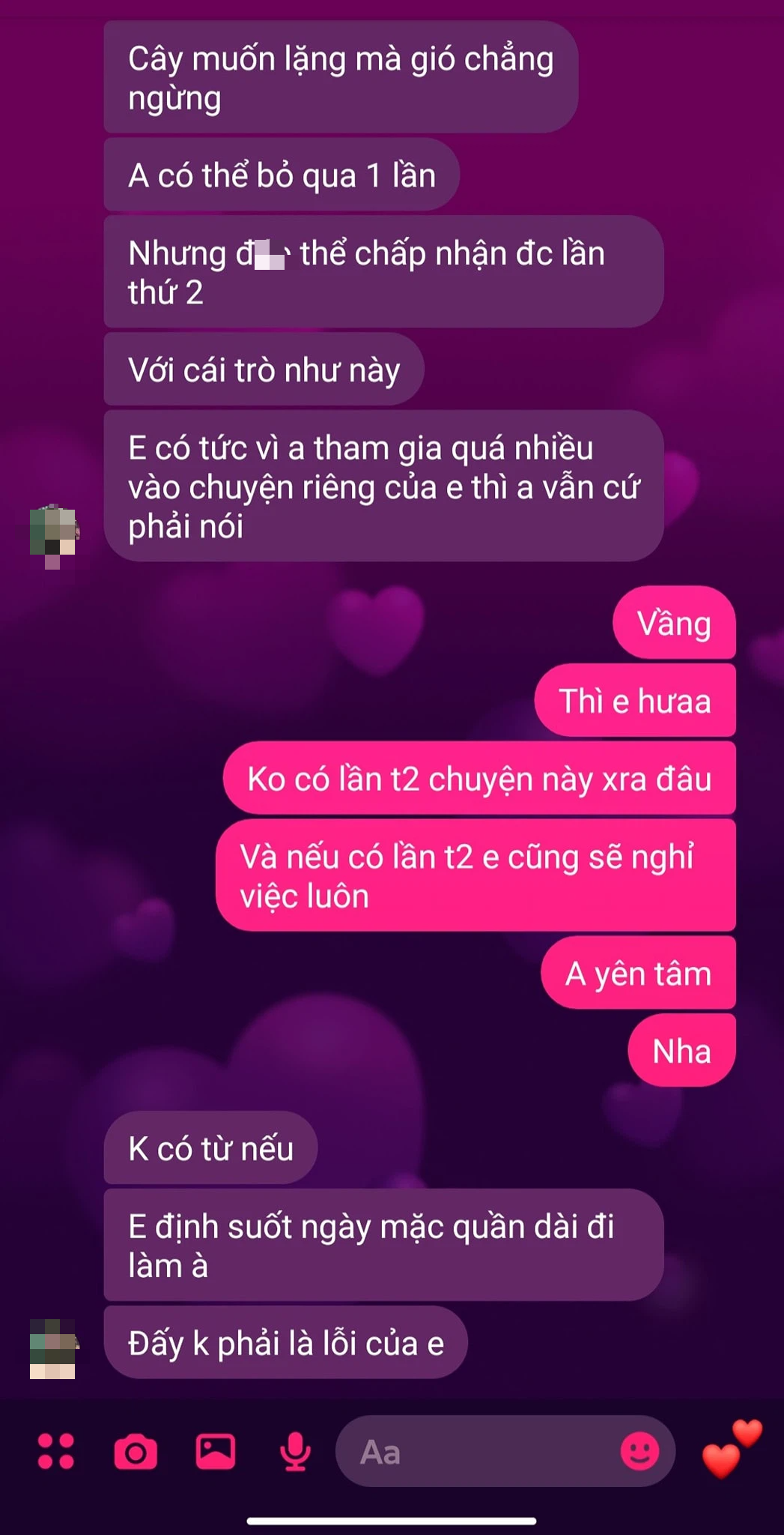 Dòng tin nhắn an ủi của người yêu K cực ấm lòng: "Em định suốt ngày mặc quần dài đi làm à? Đấy không phải là lỗi của em!" (Ảnh chụp màn hình)
