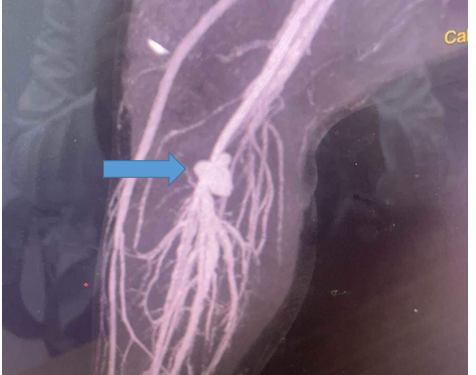 Kết quả chụp CT mạch máu cản quang cho thấy bệnh nhi bị hẹp đoạn cuối động mạch khoeo và tắc đoạn cuối tĩnh mạch kheo tại vị trí túi phình.