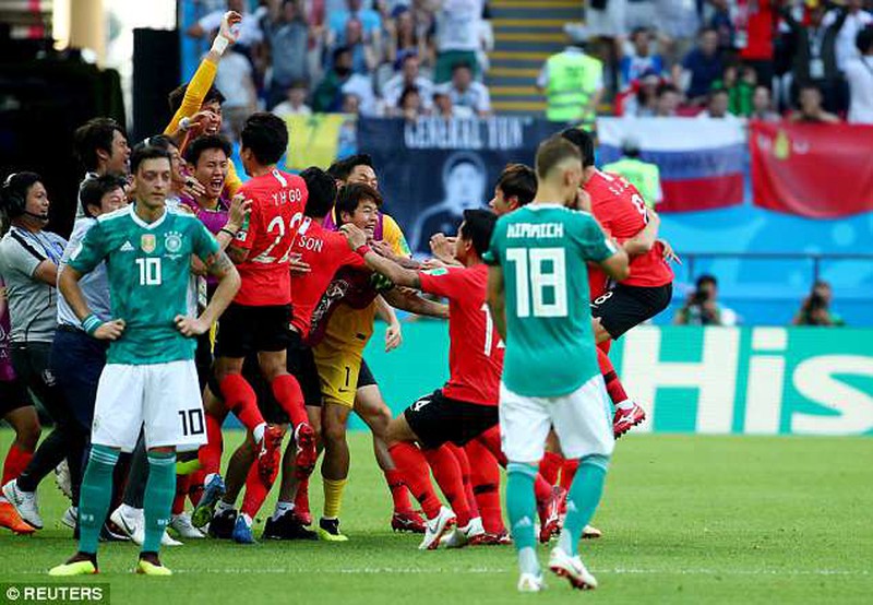 Vẻ thất thần của Ozil, trong khi các cầu thủ Hàn Quốc đang ăn mừng như thể họ giành quyền vào vòng 1/8. |