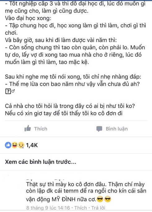 Có người lại dí dỏm “đóng vai bà mẹ” để nhắc nhờ: “Mày không thoát được đâu con trai”, “ Lấy vợ đẻ con ở riêng đi, răng có rụng thì mày vẫn là con tao, bao giờ tao chết thì mày muốn làm gì thì làm”… - những bình luận khiến chúng ta (cả cha mẹ và con cái) cùng nhìn lại chính mình.
