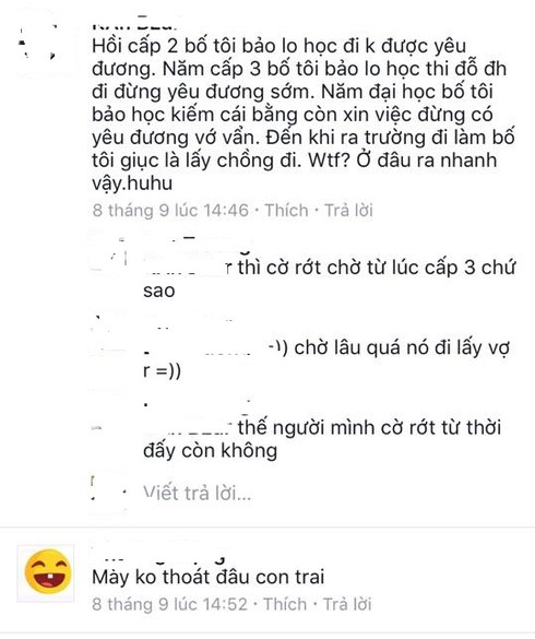 “Hồi cấp 2 bố tôi bảo lo học đi không được yêu đương. Năm cấp 3 bố tôi bảo lo học đi đỗ đại học đi đừng yêu đương sớm. Năm đại học bố tôi bảo học kiếm cái bằng còn xin việc đừng có yêu, đương vớ vẩn. Đến khi ra trường đi làm bố tôi giục là lấy chồng đi. Trời ơi, ở đâu ra người yêu nhanh vậy được chứ?” - một đọc giả khác đồng cảm.