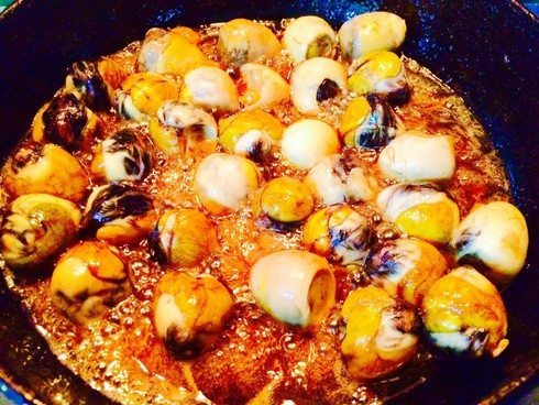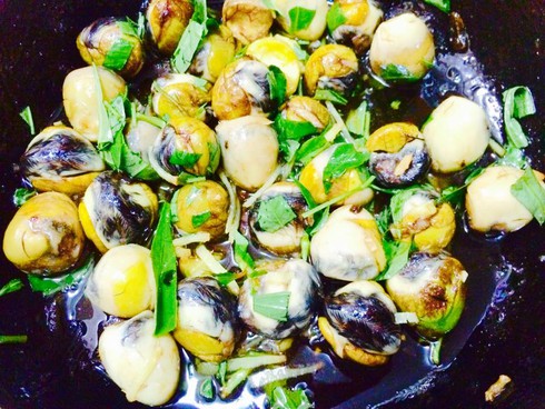 -Bước 5: Cho trứng cút lộn đã chiên sơ vào chảo sốt me, om nhỏ lửa để trứng ngấm vị sốt me và săn vào, nước sốt sánh đặc.