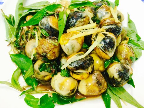 -Bước 6: Cho gừng thái sợi vào đảo đều. Tiếp tục cho rau răm thái rối vào rồi tắt bếp.Đảo đều cho rau răm chín tái là được.