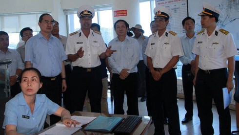Bí thư Nguyễn Thiện Nhân nghe lãnh đạo cảng Cát Lái báo cáo tình hình giao thông tại đây. |