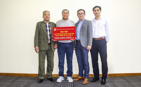 Đại diện Hóa chất Đức Giang chụp ảnh cam kết trao thưởng cùng HLV Mai Đức Chung. |