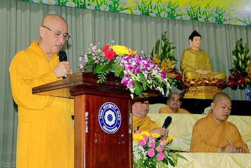 HT Thích Huệ Thông phát biểu tại lễ Tổng kết công tác từ thiện của Phật giáo Bình Dương. |