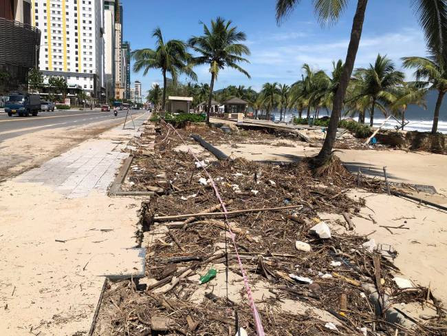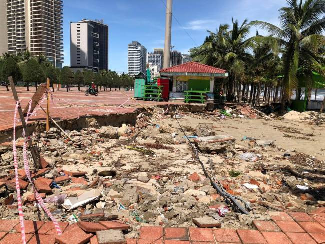 Sau trận mưa ngập lịch sử chiều tối và đêm 14/10, đến nay, bãi biển Đà Nẵng vẫn ngổn ngang rác, nhiều đoạn sạt lở, sụt lún, hư hỏng nghiêm trọng.