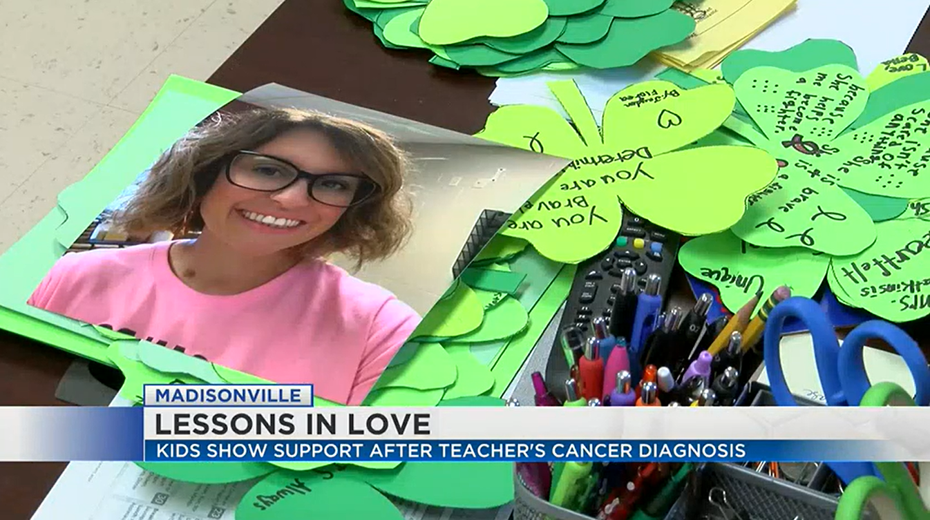 Những tấm thiệp cỏ ba lá chia sẻ những lý do học sinh yêu quý cô Watkins được trang trí khắp hành lang và trong lớp học như truyền tải lời cầu nguyện may mắn, sự tin yêu và niềm hy vọng mà các em dành cho cô.