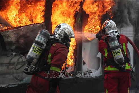 Nhân viên cứu hỏa nỗ lực dập các đám cháy do người biểu tình "Áo vàng" đốt tại đại lộ Champs Elysees ở Paris. Ảnh: AFP/TTXVN |