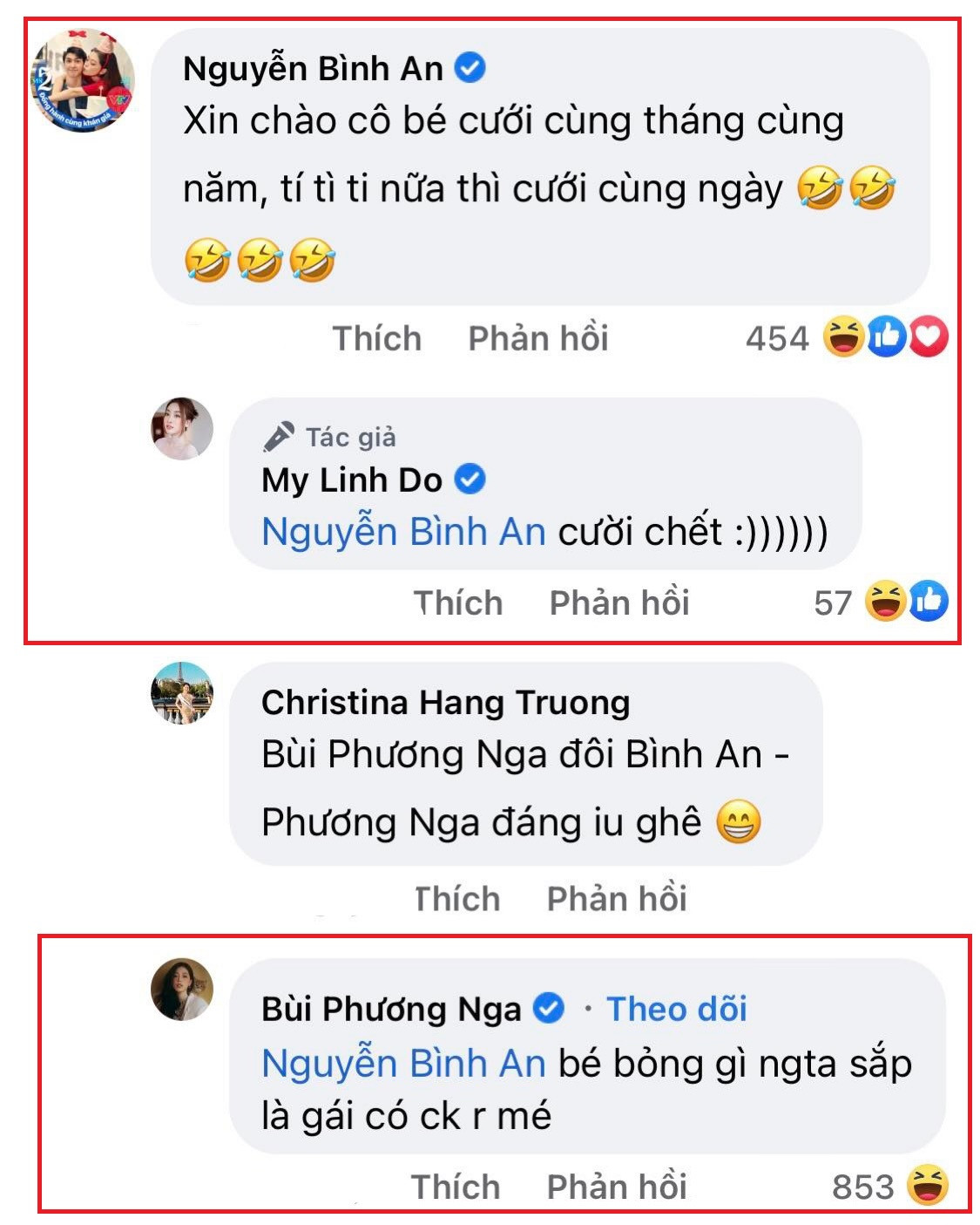 Nam diễn viên Bình An - chú rể trong tháng 10 này cũng bình luận đôi lời gửi đến nàng hậu Đỗ Mỹ Linh: “Xin chào cô bé cưới cùng tháng, cùng năm, tí nữa thì cùng ngày”.