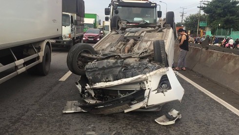 Bình Dương: Container tông lật nhào ô tô 4 chỗ, 2 vợ chồng may mắn thoát chết
