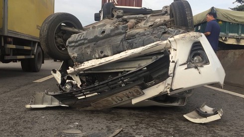 Tại hiện trường, xe ô tô 4 chỗ bị lật ngửa nằm giữa đường, hư hỏng nặng. Nhiều mảnh vỡ văng khắp mặt đường.