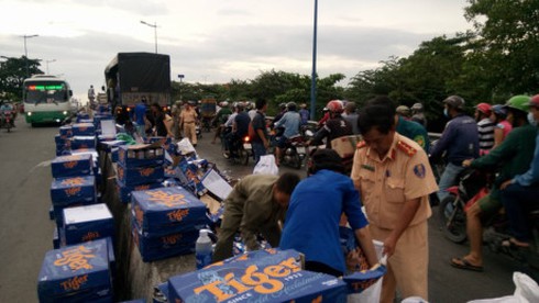 Trước đó, vào đầu tháng 6 vừa qua, 1 chiếc xe tải khi lên cầu Gò Dưa (phường Tam Bình, quận Thủ Đức, Tp.HCM) thì gặp sự cố khiến hơn 200 thùng bia rơi xuống đường. Ngay sau đó, người dân xung quanh cùng nhiều dân phòng địa phương và cảnh sát giao thông cùng xắn tay áo giúp tài xế gom bia.