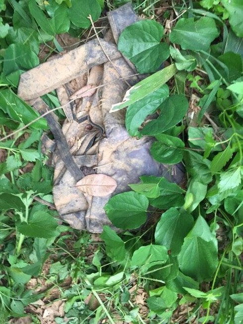Chiếc ba lô dính đầy bùn đất gần nơi phát hiện vụ việc. |