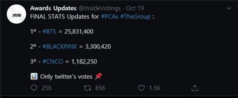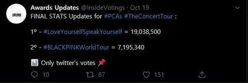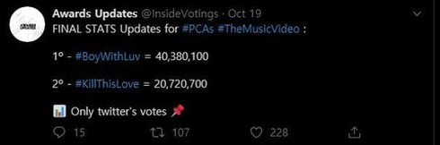 Không tính đến những khía cạnh khác như đánh giá chuyên môn thì chỉ xét lượt bầu chọn trực tuyến đã đủ cho thấy BTS hoàn toàn áp đảo đối thủ nhà YG. Ở hạng mục “Tour diễn của năm” và “MV của năm”, lượt vote của BTS hơn Black Pink gấp 2 lần, thậm chí ở hạng mục “Nhóm nhạc của năm”, số phiếu bầu chọn của BTS gấp 8 lần so với đối thủ.