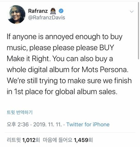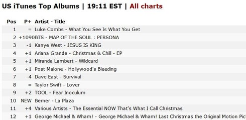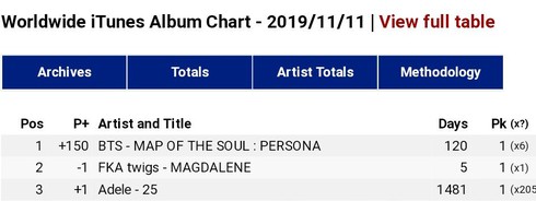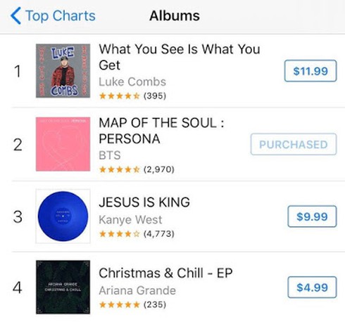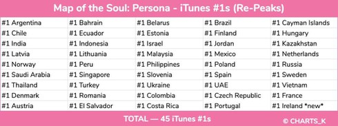 Theo cập nhật mới nhất thì đến sáng ngày 12/11, toàn bộ 13 album tiếng Hàn của BTS đã quay trở lại BXH iTunes của Mỹ, trong đó dẫn đầu là album “Map of the Soul: Persona” ở vị trí No.2. Ngoài ra, album trên cũng đang đạt hạng 1 album Bestsellers trên iTunes Mỹ. “Map of the Soul: Persona” tính đến thời điểm hiện tại đã đạt No.1 trên 45 quốc gia và dẫn đầu BXH Worldwide iTunes Album, trong đó leo hẳn lên vị trí No.2 của iTunes nước Anh (quốc gia được xem là thị trường âm nhạc khó tính nhất thế giới). Không những thế, các ca khúc mang tựa đề “Cypher” - vốn được biết đến có ý nghĩa đả kích anti-fan của BTS cũng đạt vị trí rất cao trên BXH.