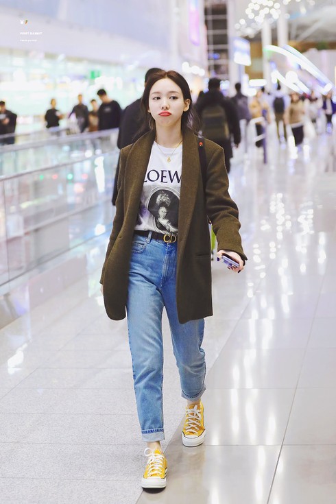 Cùng một mẫu váy nhưng khi Nayeon diện lên người thì mang đến cảm giác tươi trẻ, đáng yêu giống với hình tượng mà nữ ca sĩ luôn theo đuổi. Phối hợp cùng áo thun trắng tay dài đơn giản và điểm nhấn nằm ở chiếc mũ beret màu hồng trên đầu giúp Nayeon "ghi điểm" trong mắt fan hâm mộ.