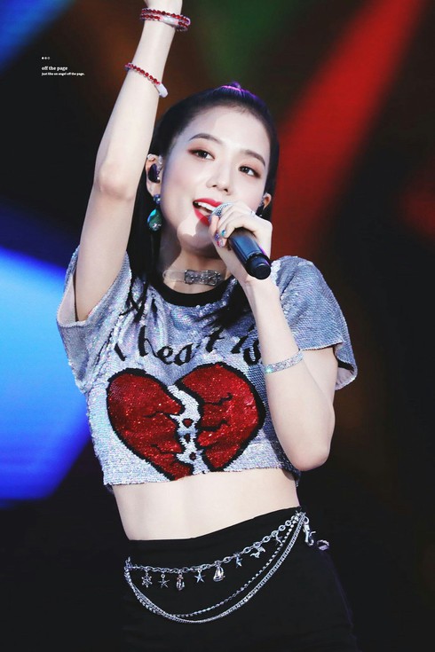 Chiếc áo lấp lánh này từng xuất hiện trong cả màn trình diễn của Jisoo (BLACKPINK) và Jeongyeon (TWICE). Vẫn như mọi lần, stylist của 4 cô gái nhà YG Entertainment luôn cách điệu chiếc áo bằng cách biến chúng thành kiểu crop-top mạnh mẽ, khoe được vòng eo con kiến quyến rũ.