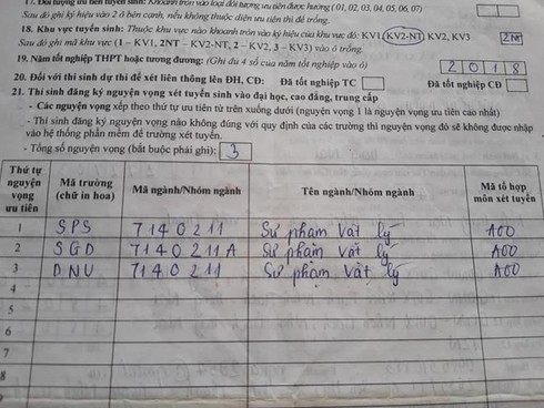 Trước đó, Infonet đã đưa tin về trường hợp của thí sinh N.M.Q. (Đồng Nai), em này cho biết em đăng ký 3 NV vào ngành sư phạm Vật lý của trường ĐH Sư phạm TP Hồ Chí Minh (NV1), trường ĐH Sài Gòn (NV2) và trường ĐH Đồng Nai (NV3). Khi biết được 22,3 điểm, em nghĩ chắc chắn mình sẽ đỗ NV 3 vào trường ĐH Đồng Nai vì mọi năm, ngành này lấy điểm khá thấp. Vì thế không đăng ký bổ sung thêm nguyện vọng nào khác.