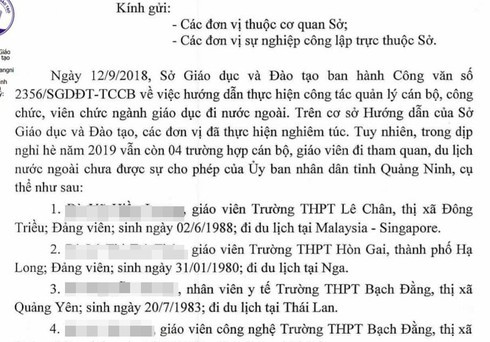 Qua rà soát, Sở GD-ĐT Quảng Ninh phát hiện trong dịp nghỉ hè năm 2019, có 4 giáo viên đi tham quan, du lịch nước ngoài nhưng chưa được sự cho phép của UBND tỉnh, gồm: Vũ Hiền Lương (giáo viên Trường THPT Lê Chân, thị xã Đông Triều) đi du lịch các nước Malaysia, Singapore; Lê Thị Trà Thúy (giáo viên Trường THPT Hòn Gai, TP Hạ Long) đi du lịch Nga; Nguyễn Trà Ly (nhân viên y tế) và Lê Thị Huê (giáo viên) của Trường THPT Bạch Đằng, thị xã Quảng Yên đi du lịch Thái Lan.