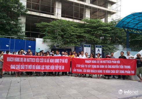 Mới đây nhất, ngày 15/9, những người mua nhà đã cùng nhau đến dự án Hattoco tập trung căng băng rôn thể hiện sự bức xúc, sự mong mỏi dự án hoàn thành để được nhận nhà về ở của hàng trăm khách hàng.