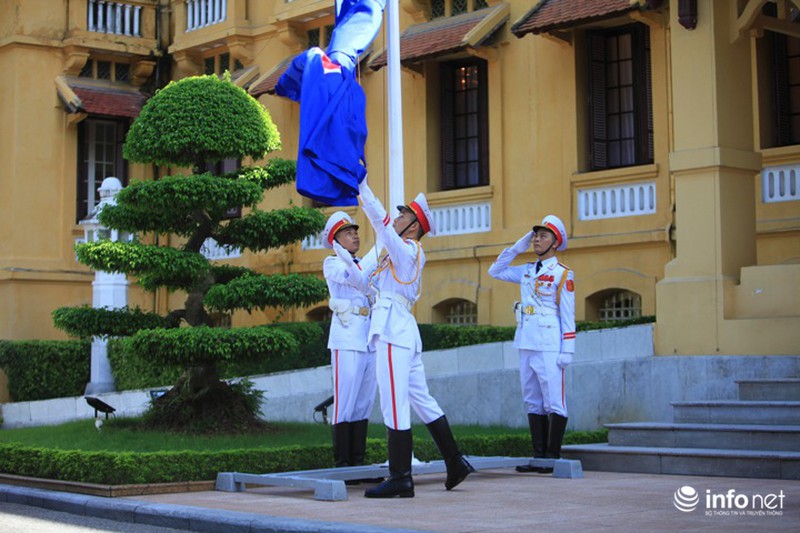 Đúng 7h30, lá cờ ASEAN được các thành viên đội danh dự gắn vào cột cờ, từ từ kéo lên trước sự chứng kiến của các quan khách. |