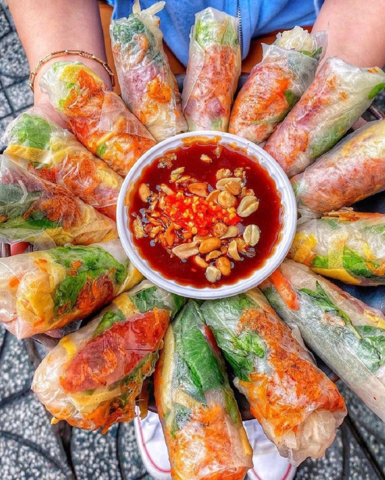 Tại miền Nam và TP HCM, mọi người thường ăn bò bía mặn (ảnh) với nhân thường có lạp xưởng, trứng tráng, cà rốt, rau xà lách, củ sắn, tôm khô, rau thơm. Tất cả được cắt sợi nhỏ, cuộn với bánh tráng thành các cuốn vừa ăn, chấm với tương ớt xí muội chua ngọt, trộn với đậu phộng rang nhỏ, hành khô phi vàng. Ảnh: Instagram/homnay tuiangi