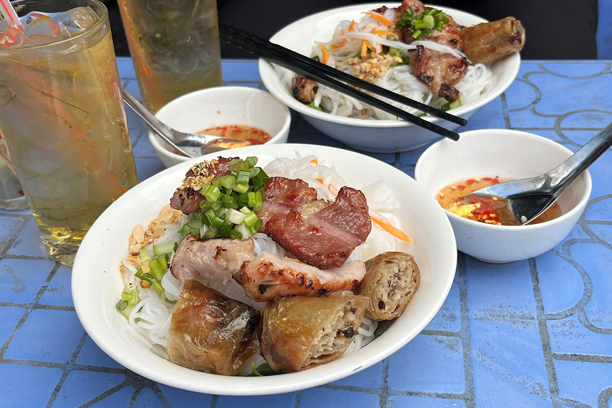 Miêu tả về bún thịt nướng, Taste Atlas viết: "Món ăn Việt này kết hợp thịt lợn nướng được tẩm ướp, bún gạo, rau sống, ăn kèm nước chấm được pha thêm đường, nước, chanh. Bún thịt nướng thường gắn liền với ẩm thực miền Nam, và có liên quan với món bún chả - thứ được coi là đặc sản Hà Nội". Ảnh: Huỳnh Nhi