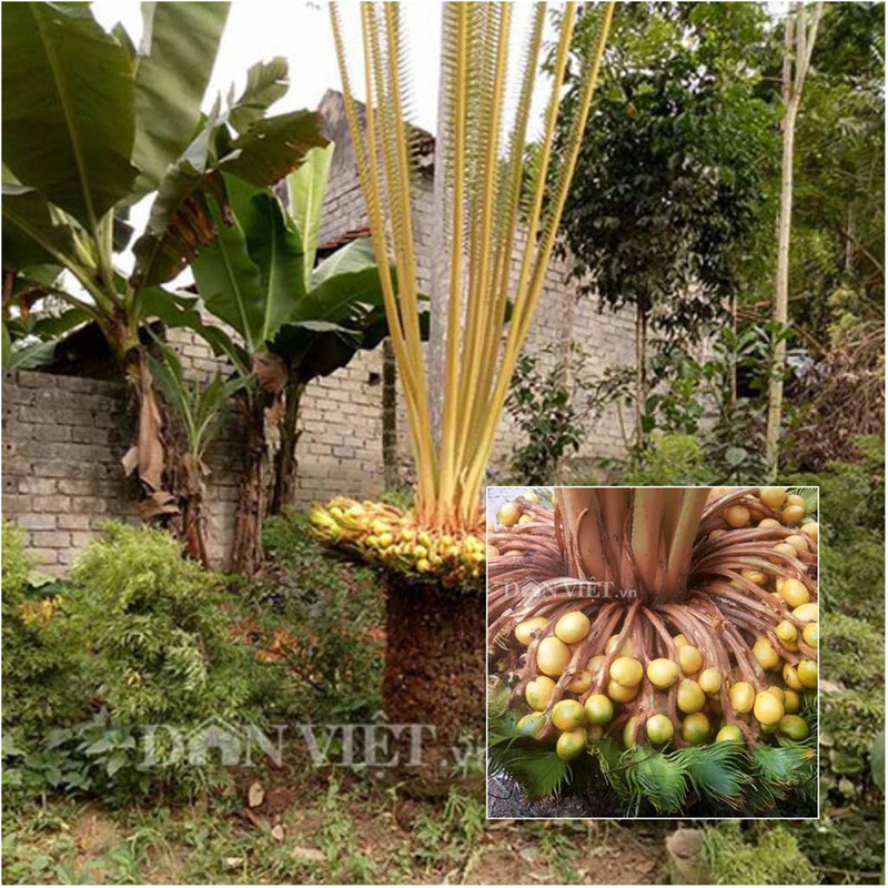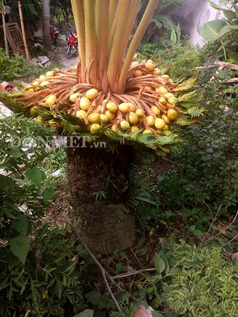 Thân cây vạn tuế cao khoảng 0,8m, đường kính 25cm, trên ngọn cây mọc ra từng chùm quả, ước chừng khoảng 400 quả, nhìn tựu một mâm đầy ắp hoa quả vậy. Và chen vào giữa ngọn cây có 15 tàu lá non đang vươn cao khoảng 2,5m. (Ảnh: Dân Việt) Gặp đất lạ, cây vạn tuế nhanh chóng phát triển xanh tốt, vươn cao. Anh Thắng cho biết, cây vạn tuế mỗi năm thay một lần lá. Số lượng tàu lá cũng nhiều lên theo từng năm. Tuy nhiên, từ khi anh trồng cây vạn tuế này đến nay, thì đây mới là lần thứ 3 cây vạn tuế ra hoa. Và đây là lần đầu tiên vạn tuế đậu quả sai trĩu, to, tròn, vàng óng trông như những "quả trứng vàng" rất đẹp. |