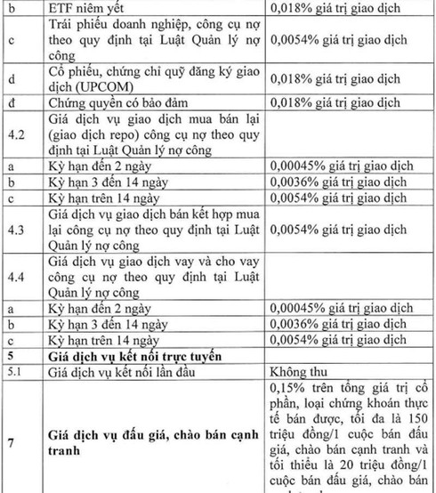 Theo đó, giá dịch vụ giao dịch cổ phiếu, chứng chỉ quỹ đầu tư niêm yết (không bao gồm ETF) chỉ còn 0,027% giá trị giao dịch; cổ phiếu, chứng chỉ quỹ đăng ký giao dịch Upcom còn 0,018%.