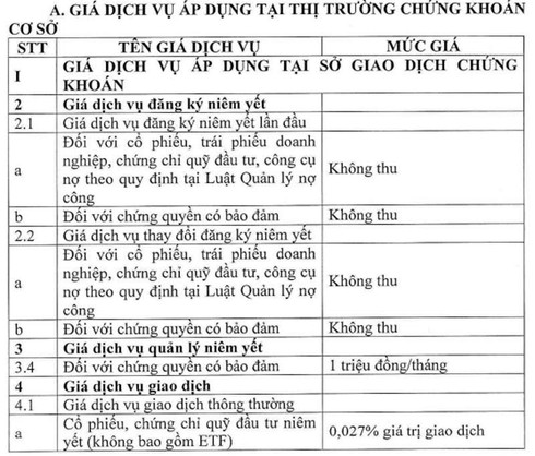 Không thu - miễn hoàn toàn đối với 6 dịch vụ bao gồm: dịch vụ đăng ký niêm yết; đăng ký chứng khoán; dịch vụ kết nối trực tuyến lần đầu; dịch vụ vay, cho vay chứng khoán qua hệ thống VSD; đăng ký thành viên giao dịch chứng khoán phái sinh; đăng ký thành viên bù trừ.