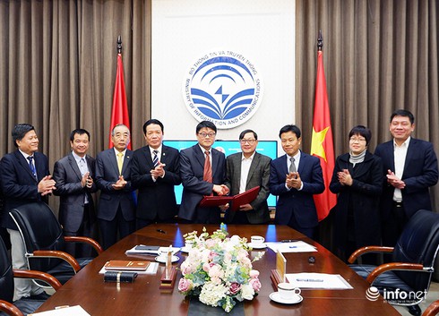 Thứ trưởng Bộ TT&TT Hoàng Vĩnh Bảo (thứ tư từ trái sang) chứng kiến lễ ký kết chuyển giao Cổng thông tin điện tử liệt sĩ, mộ liệt sĩ và nghĩa trang liệt sĩ giữa Viện Công nghiệp phần mềm và nội dung số Việt Nam (thuộc Bộ TT&TT) với Cục Người có công (Bộ LĐTB&XH). |