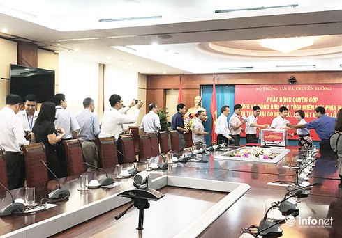 Ủy viên Ban Chấp hành Trung ương Đảng, Bộ trưởng Bộ TT&TT Trương Minh Tuấn tới dự và trực tiếp ủng hộ tại buổi phát động quyên góp ủng hộ đồng bào bị thiệt hại do mưa lũ. |