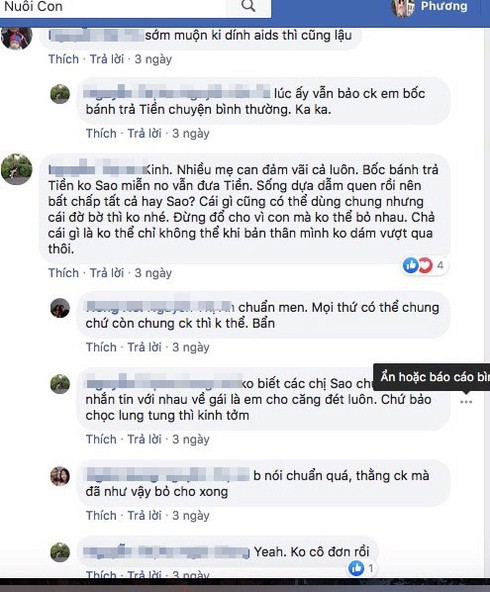 Bạn Nguyễn An thì gay gắt hơn nữa: "Kinh, nhiều mẹ can đảm quá. Bóc bánh trả tiền không sao ư, miễn chồng vẫn đưa tiền ư. Sống dựa dẫm quen rồi nên bất chấp tất cả hay sao? Cái gì cũng có thể dùng chung nhưng chồng thì riêng nhé. Đừng đổ cho vì con mà không thể bỏ nhau. Chả cái gì là không thể, chỉ không thể khi bản thân mình không dám vượt qua thôi".