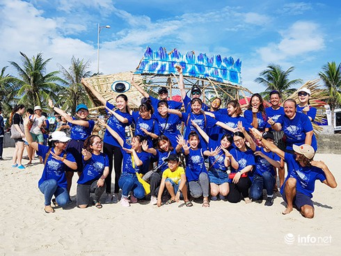 Các giáo viên người nước ngoài và sinh viên tình nguyện Đà Nẵng thực hiện dự án“Bống” (Goby) đặt trên bãi biển T18 (Ảnh: HC) |