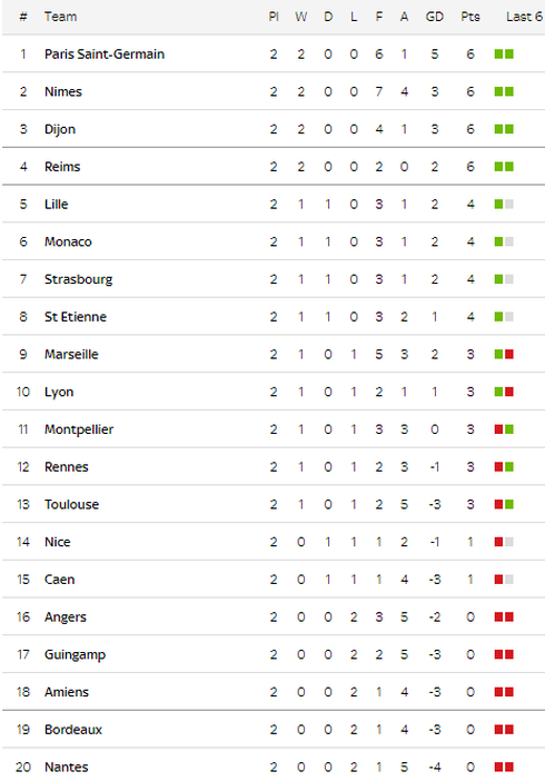 Bảng xếp hạng 20 CLB Giải hạng Nhất nước Pháp sau 2 vòng đấu. |