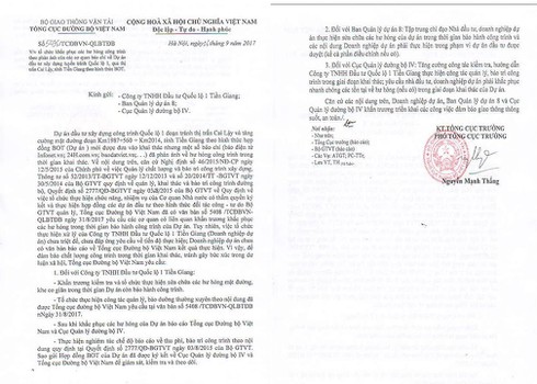 Ngày 6/9, Tổng cục Đường bộ Việt Nam vừa có văn bản yêu cầu công ty TNHH Đầu tư quốc lộ 1 Tiền Giang khẩn trương kiểm tra và thực hiện sửa chữa các hư hỏng mặt đường, khe co giãn trong thời gian dự án còn bảo hành |