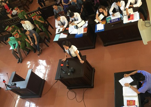 Các bị cáo Hoàng Công Lương (áo xanh), Bùi Anh Quốc (áo phông cộc tay) và Trần Văn Sơn (áo sơ mi, ngồi hàng thứ 2) phải hầu tòa vì sự cốy khoa làm 9 người chết trong quá trình chạy thận vào ngày 29/5/2017 tại BVĐK tỉnh Hòa Bình. |